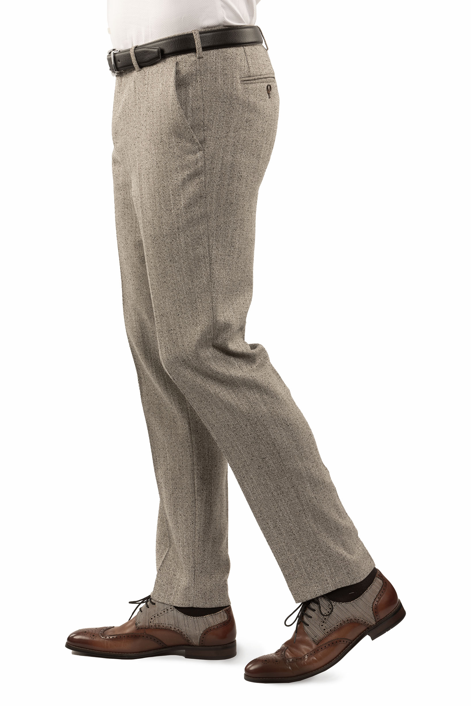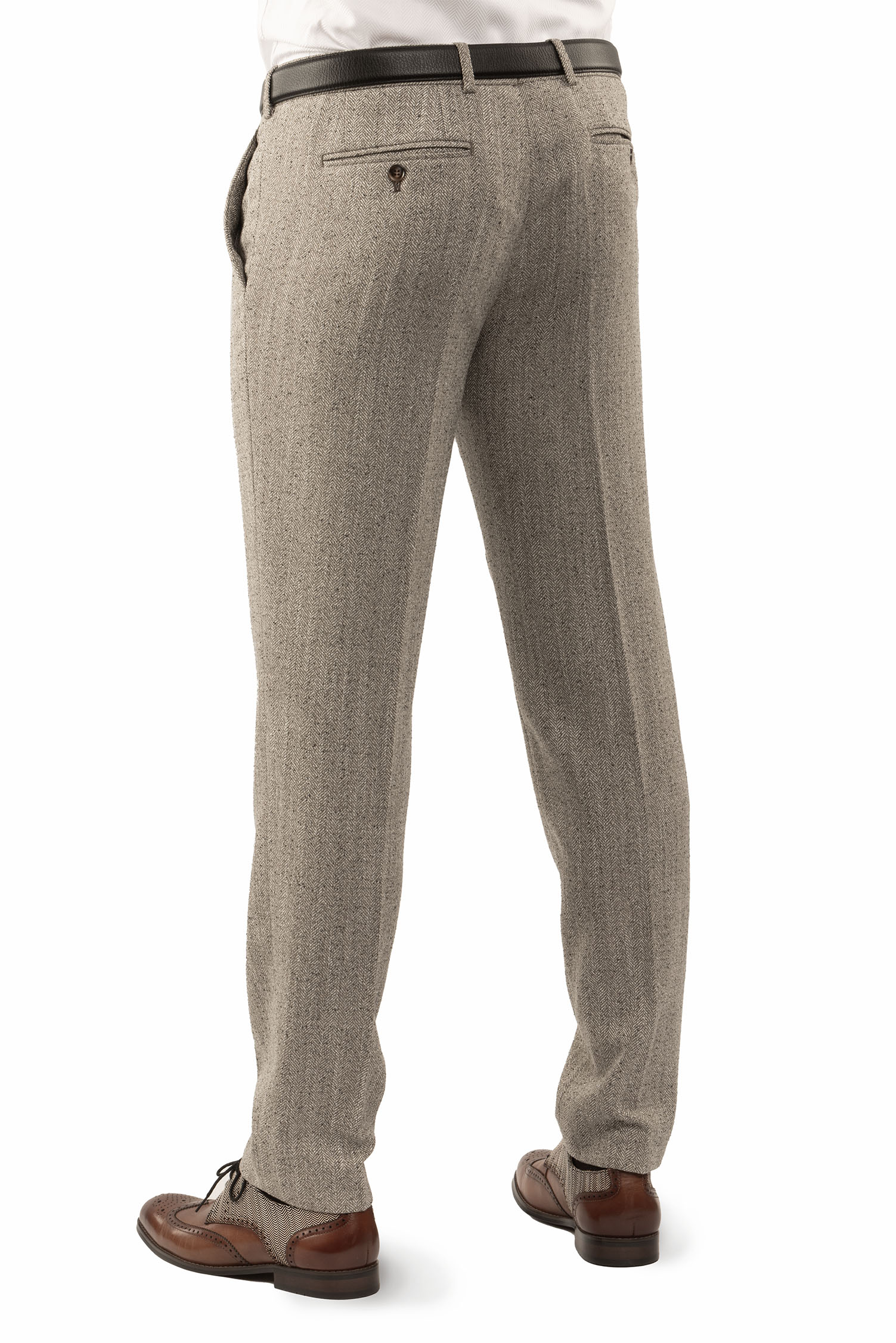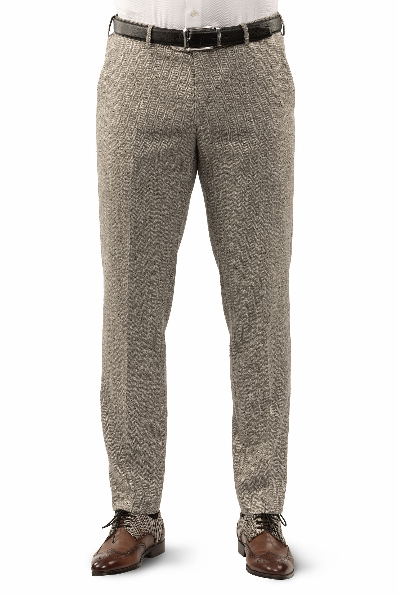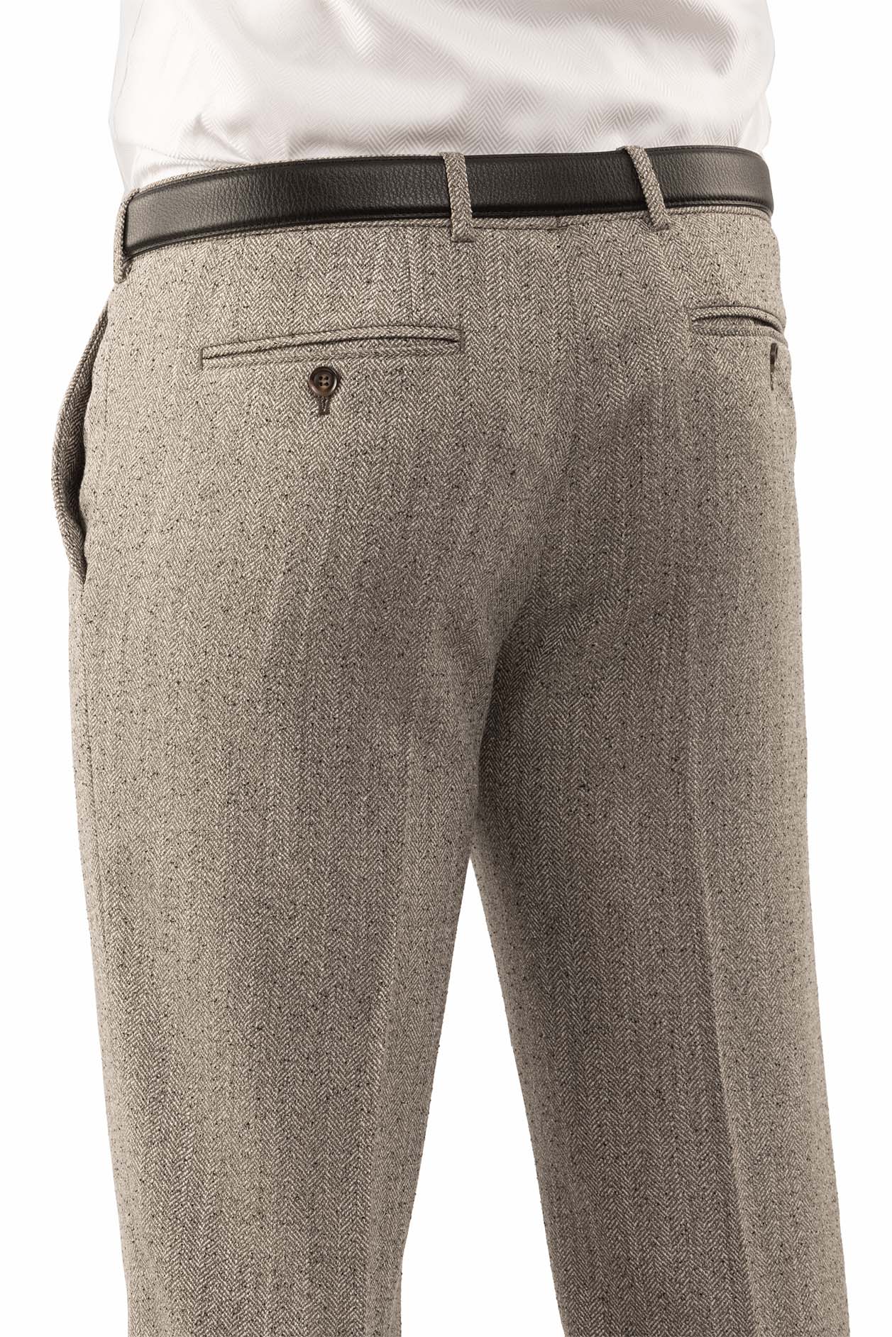 Классические мужские брюки в бежевом оттенке с фактурным твидовым переплетением - стильная основа для элегантного повседневного гардероба. Благородная текстура ткани с лёгким узором «ёлочка» придаёт образу глубину и аристократичный характер.
