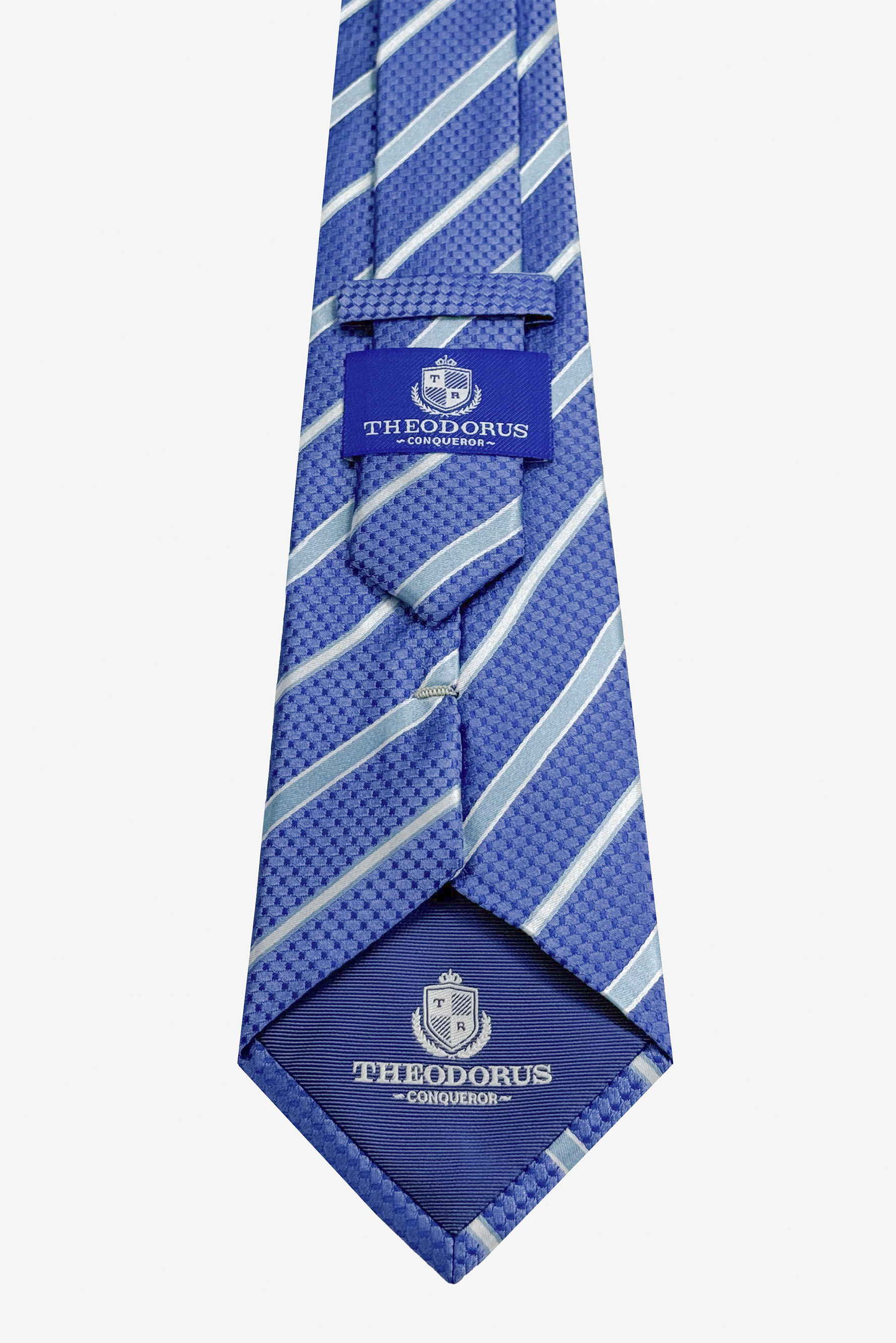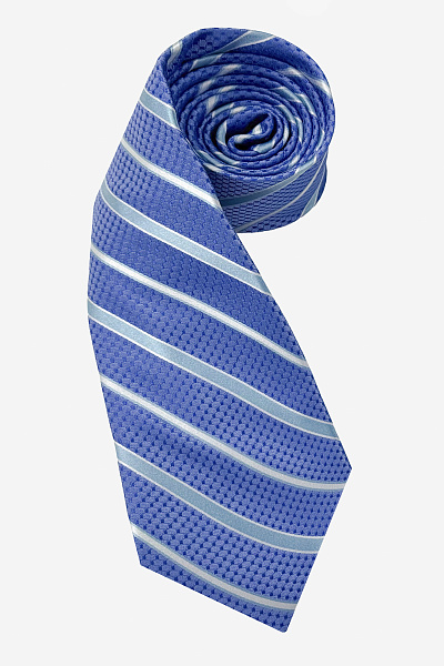 Галстук «Виндзор» в насыщенном голубом цвете с диагональными светлыми полосами - выразительная классика с современным настроением. Контрастный рисунок подчёркивает динамику образа, а рельефная фактура придаёт ткани глубину и объём.