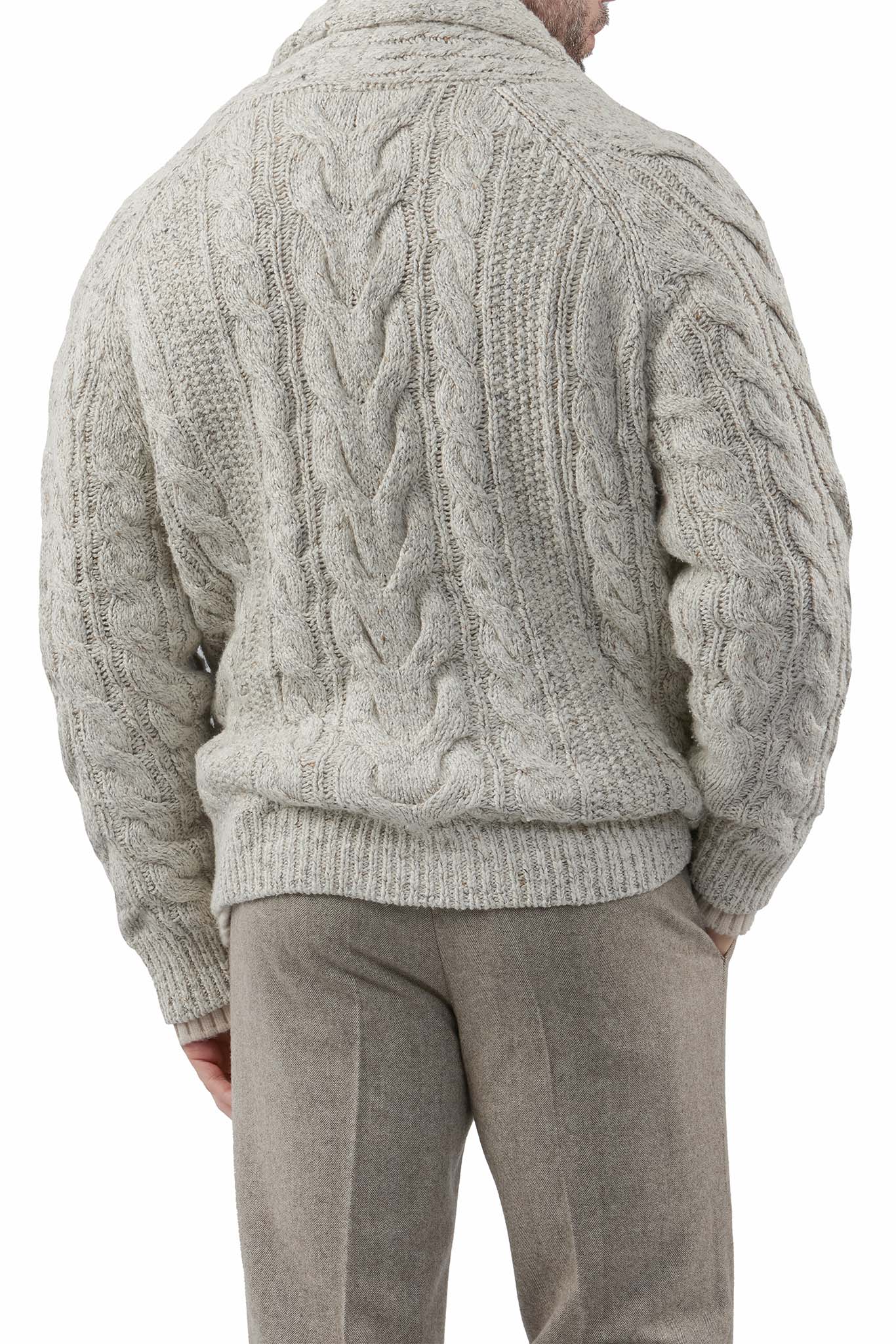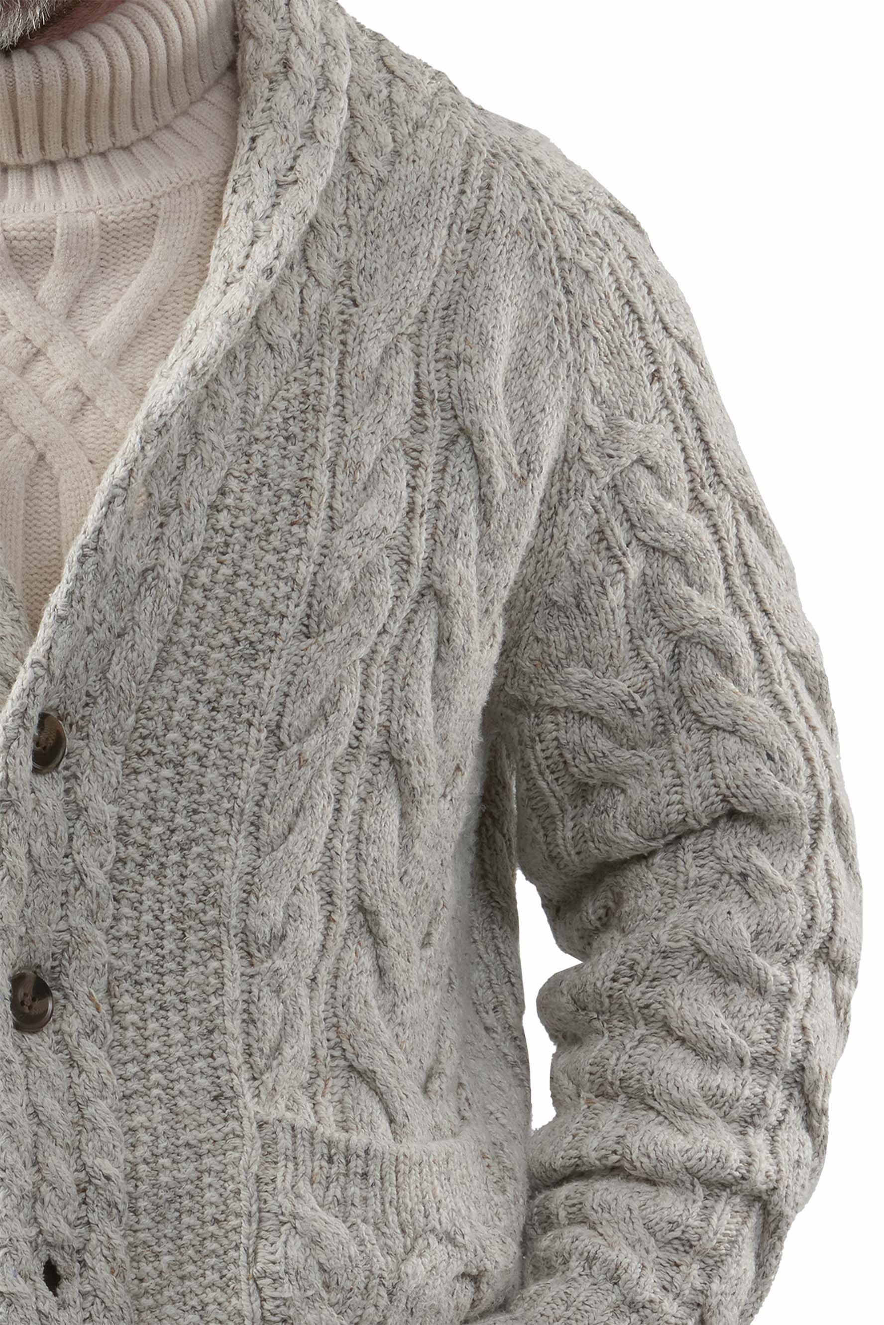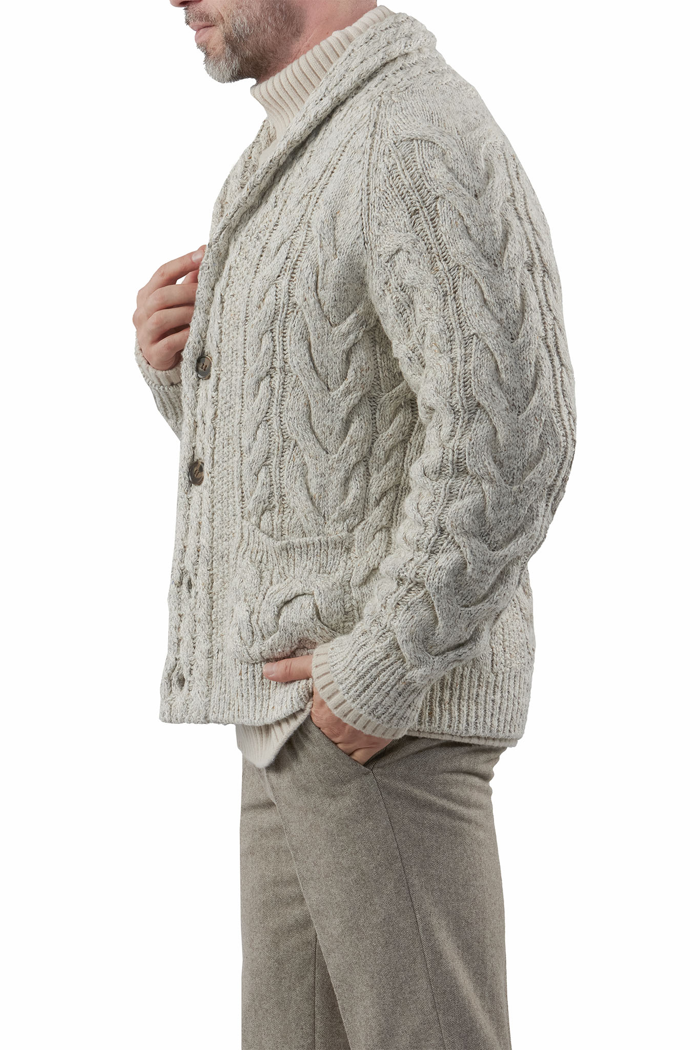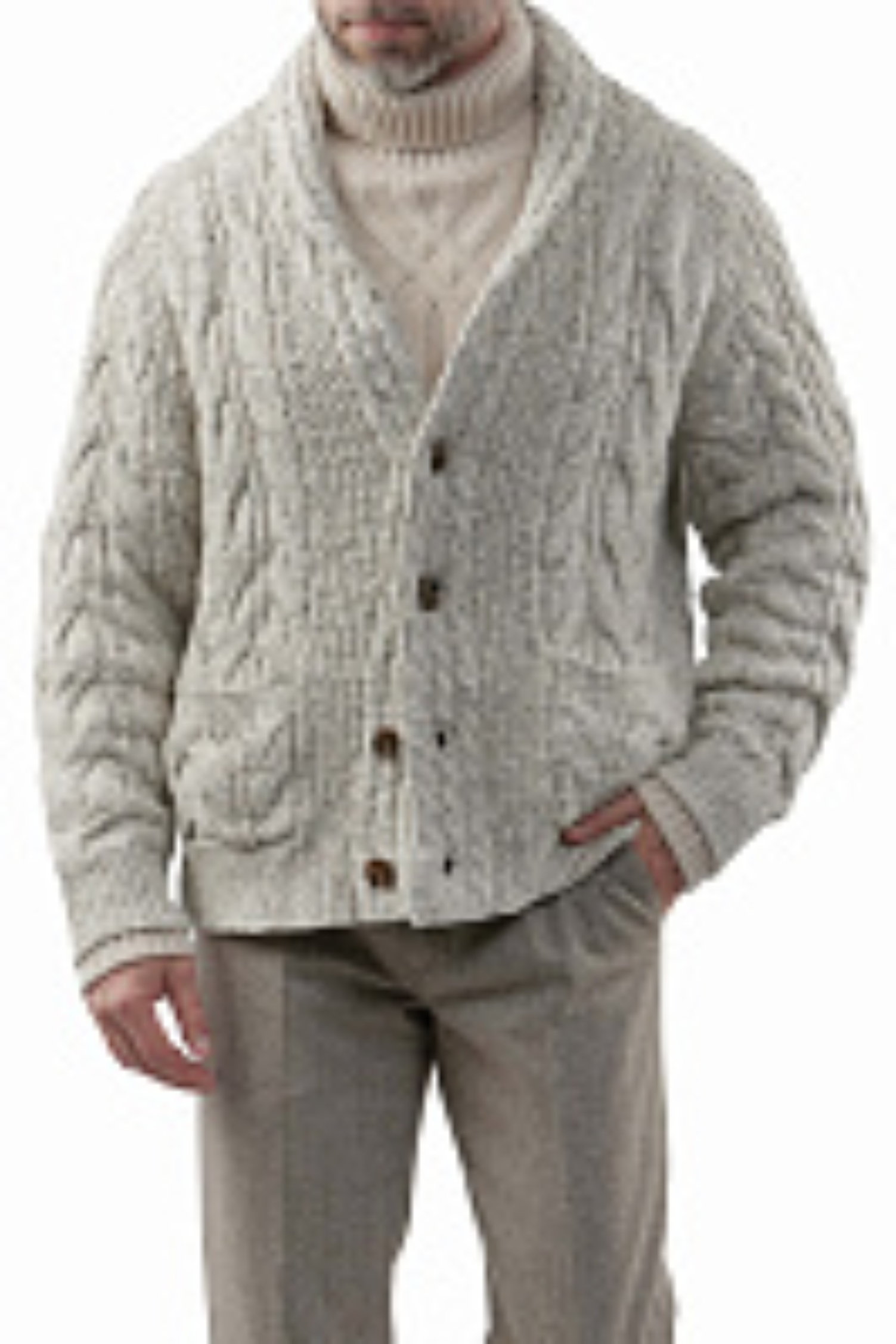 Модель украшена выразительной фактурной вязкой с классическим узором «косы», который придаёт объём и подчёркивает статусность изделия. Шалевый воротник формирует благородный силуэт и делает образ более завершённым - кардиган одинаково органично смотрится как с водолазкой, так и с рубашкой.