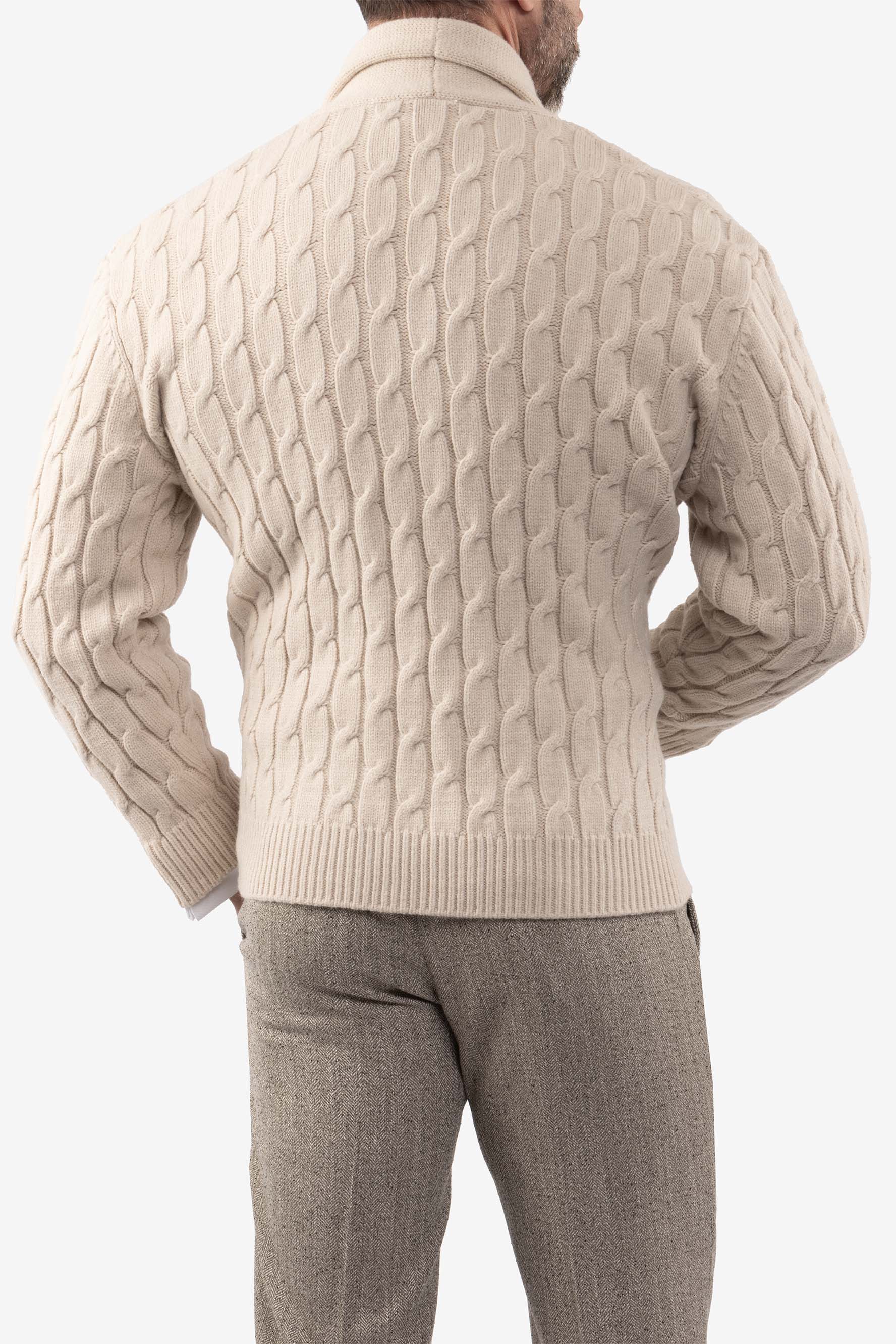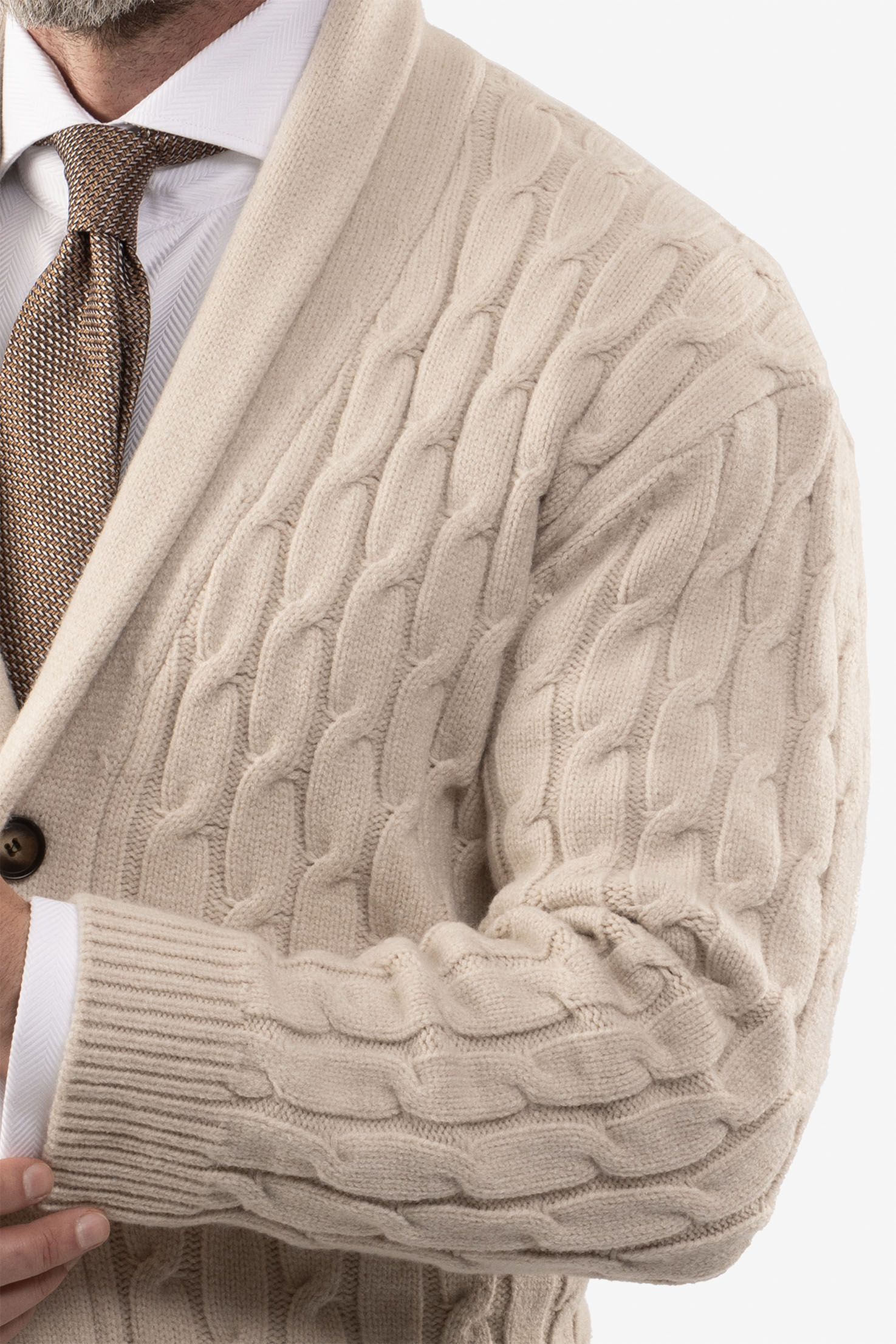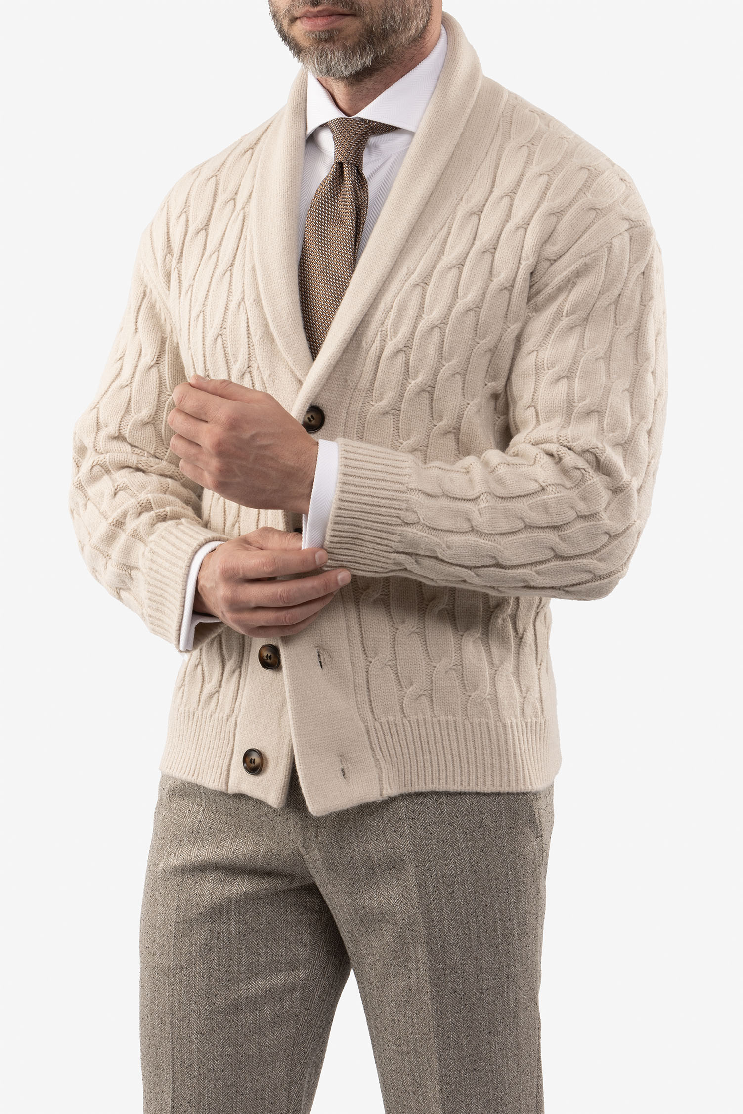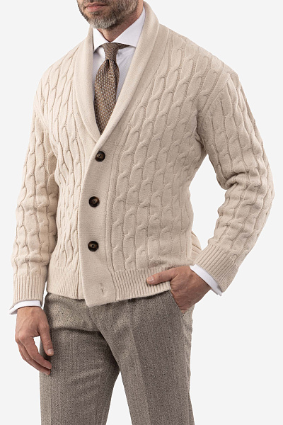 Элегантный кардиган в светлом бежевом оттенке - универсальная модель для создания утончённых и гармоничных образов. Фактурная вязка с вертикальными косами придаёт изделию выразительность и подчёркивает статусный характер модели.