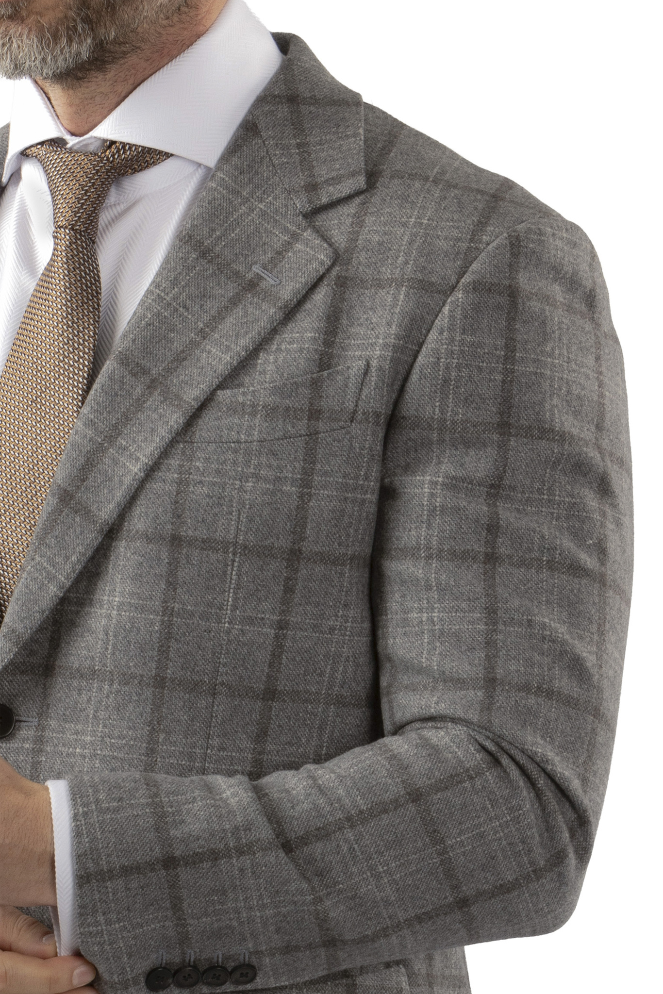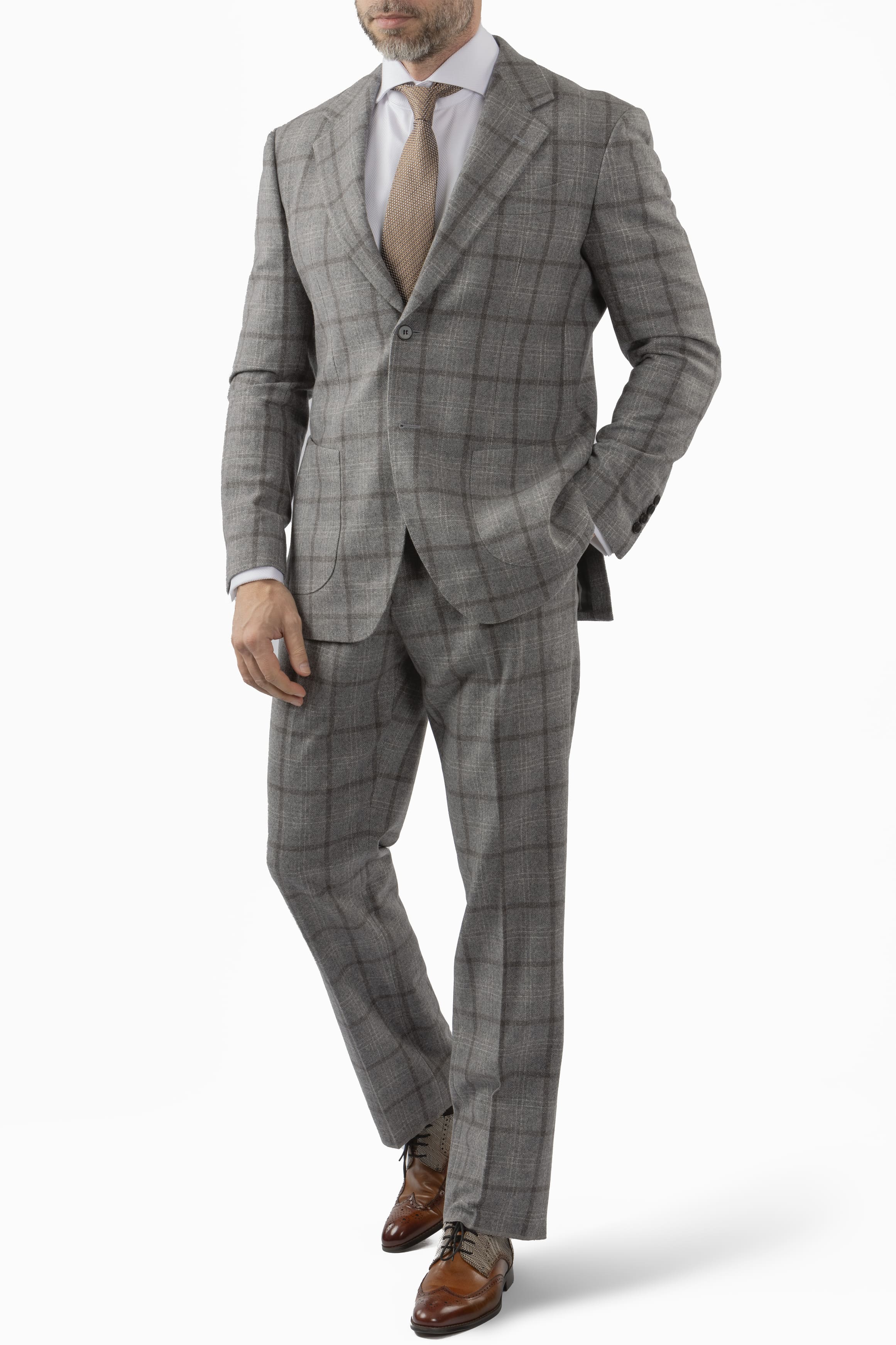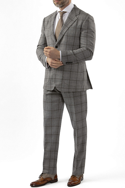 Элегантный мужской костюм в серой клетке - универсальное решение для делового гардероба и статусных мероприятий. Классический рисунок придаёт образу выразительность, оставаясь сдержанным и стильным.