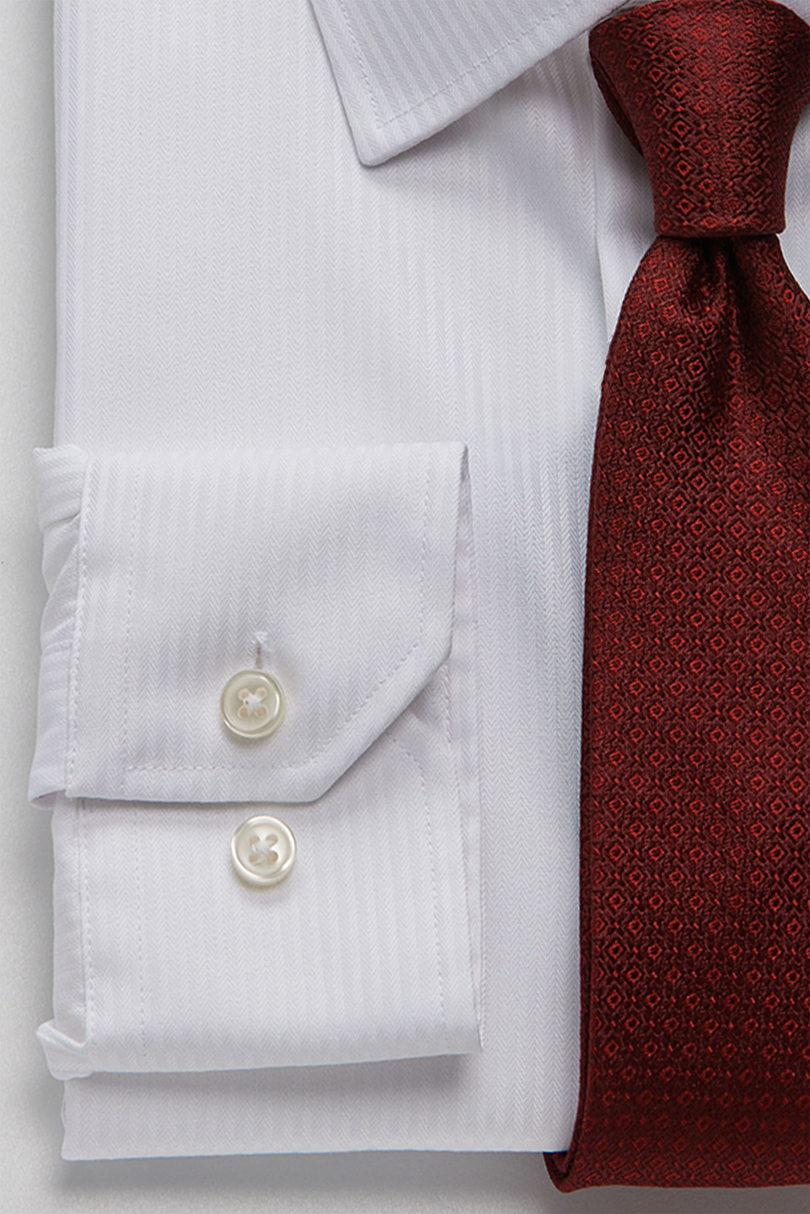 Рубашка имеет неприталенный силуэт и строгий классический воротник со съёмным фиксатором, поэтому выглядит собранно и держит форму. Ткань в мелкую полоску приятная, шелковисто-гладкая на ощупь, а манжеты на пуговице «Angled» добавляют аккуратную современную деталь.