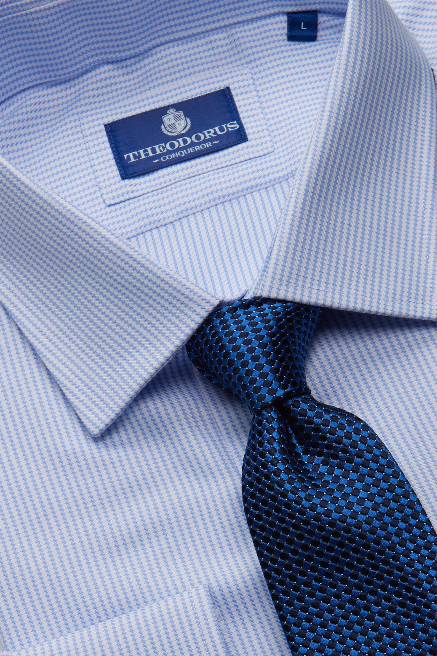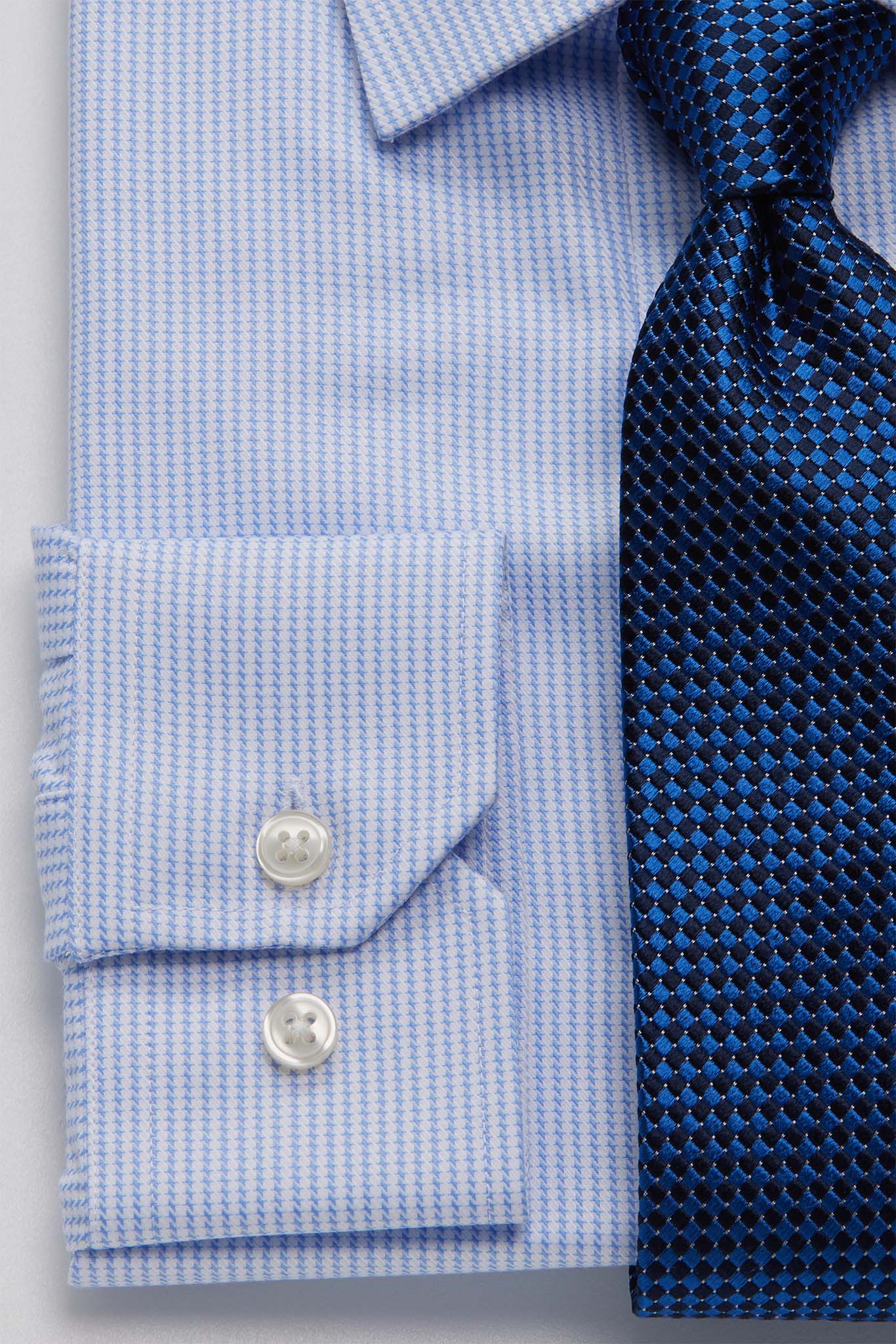 Эта рубашка - удачный вариант для тех, кто хочет добавить образу выразительности, не выходя за рамки делового стиля. Рисунок «гусиная лапка» создаёт интересную текстуру ткани и смотрится сдержанно даже в официальной обстановке.