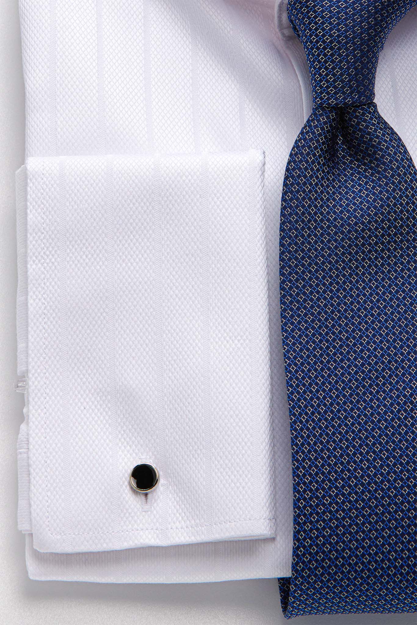Белая рубашка с выразительной вертикальной фактурой - элегантный вариант для формальных и торжественных образов. Тонкая полоска создаёт аккуратный рельеф и делает классический белый цвет более глубоким и интересным.