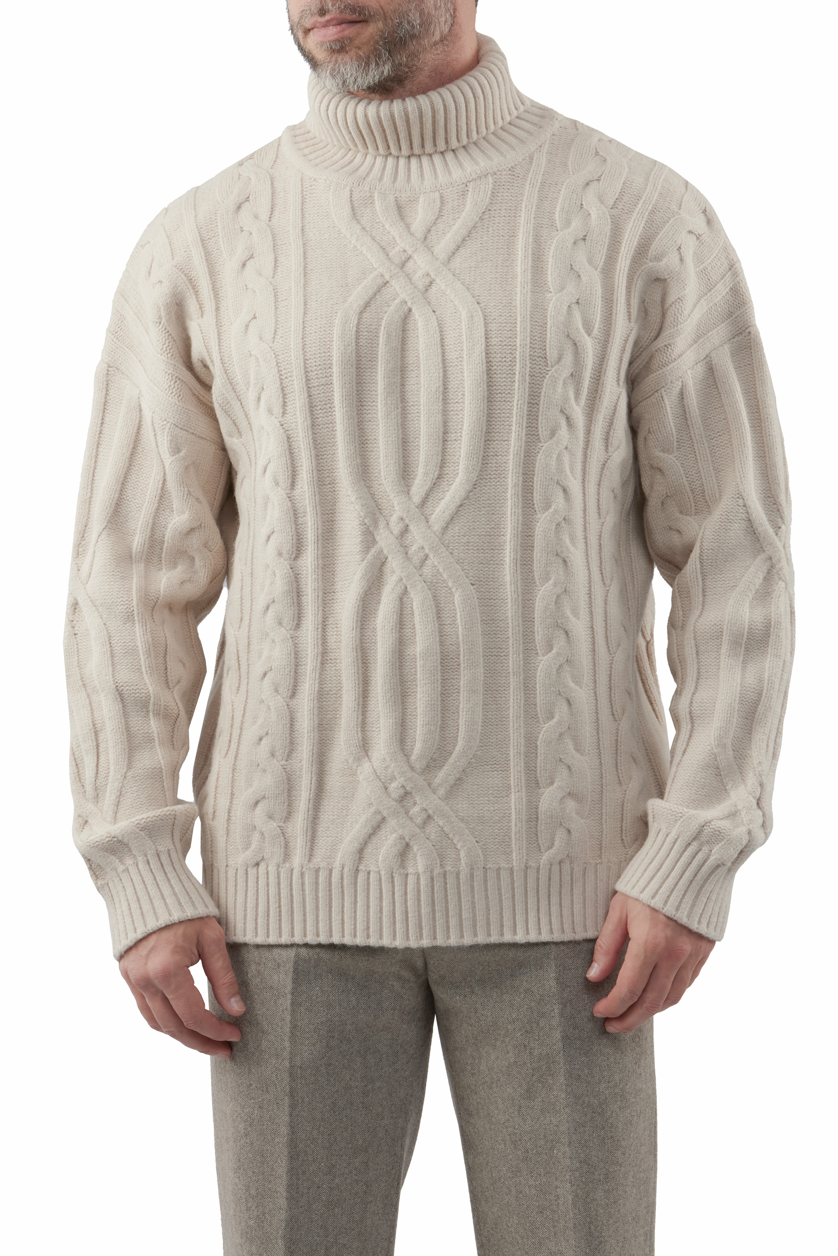 Элегантный мужской свитер в светлом бежевом оттенке - стильная и тёплая модель для холодного сезона. Объёмная фактурная вязка с выразительным узором «косы» придаёт изделию характер и подчёркивает премиальный внешний вид.