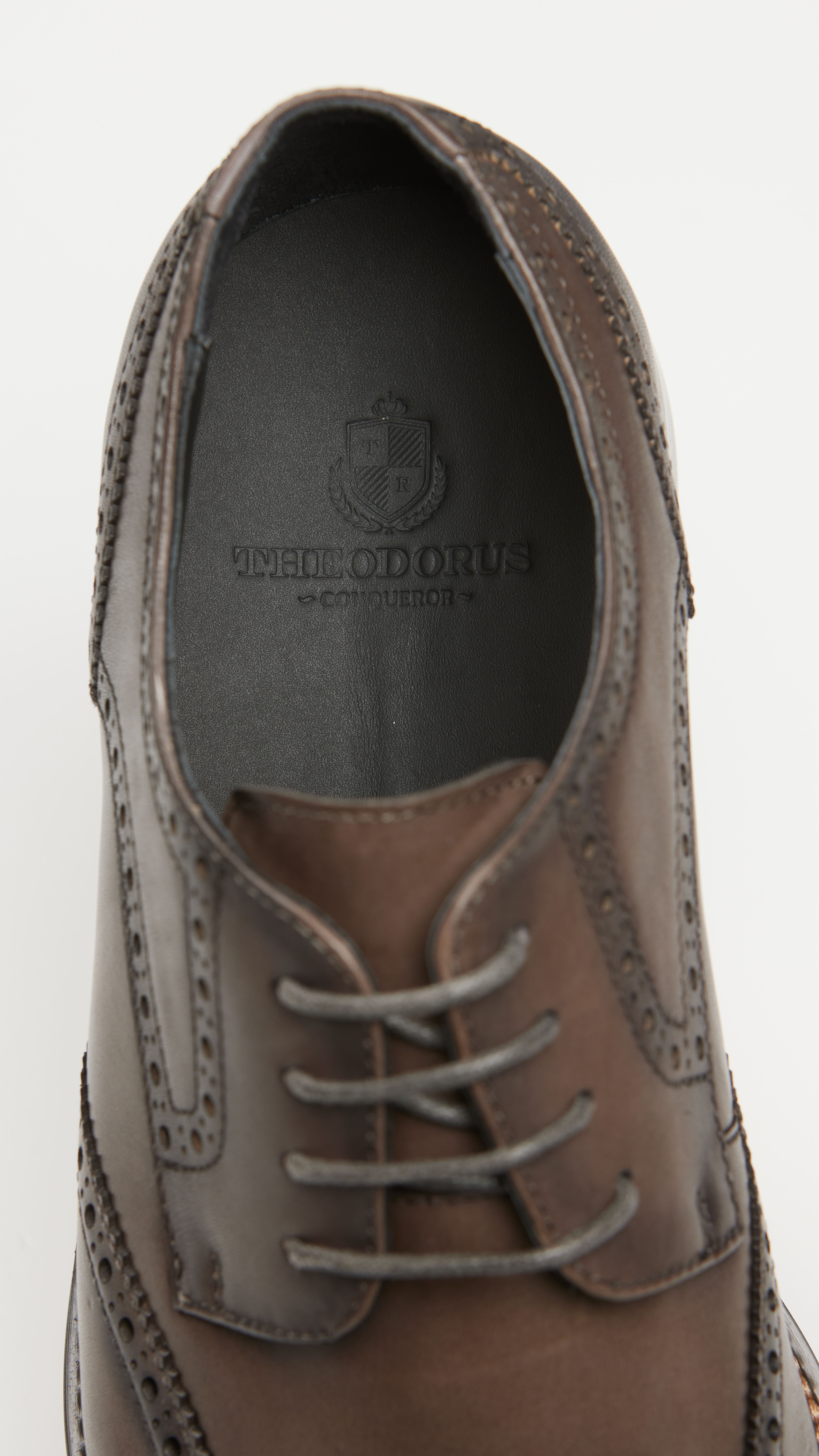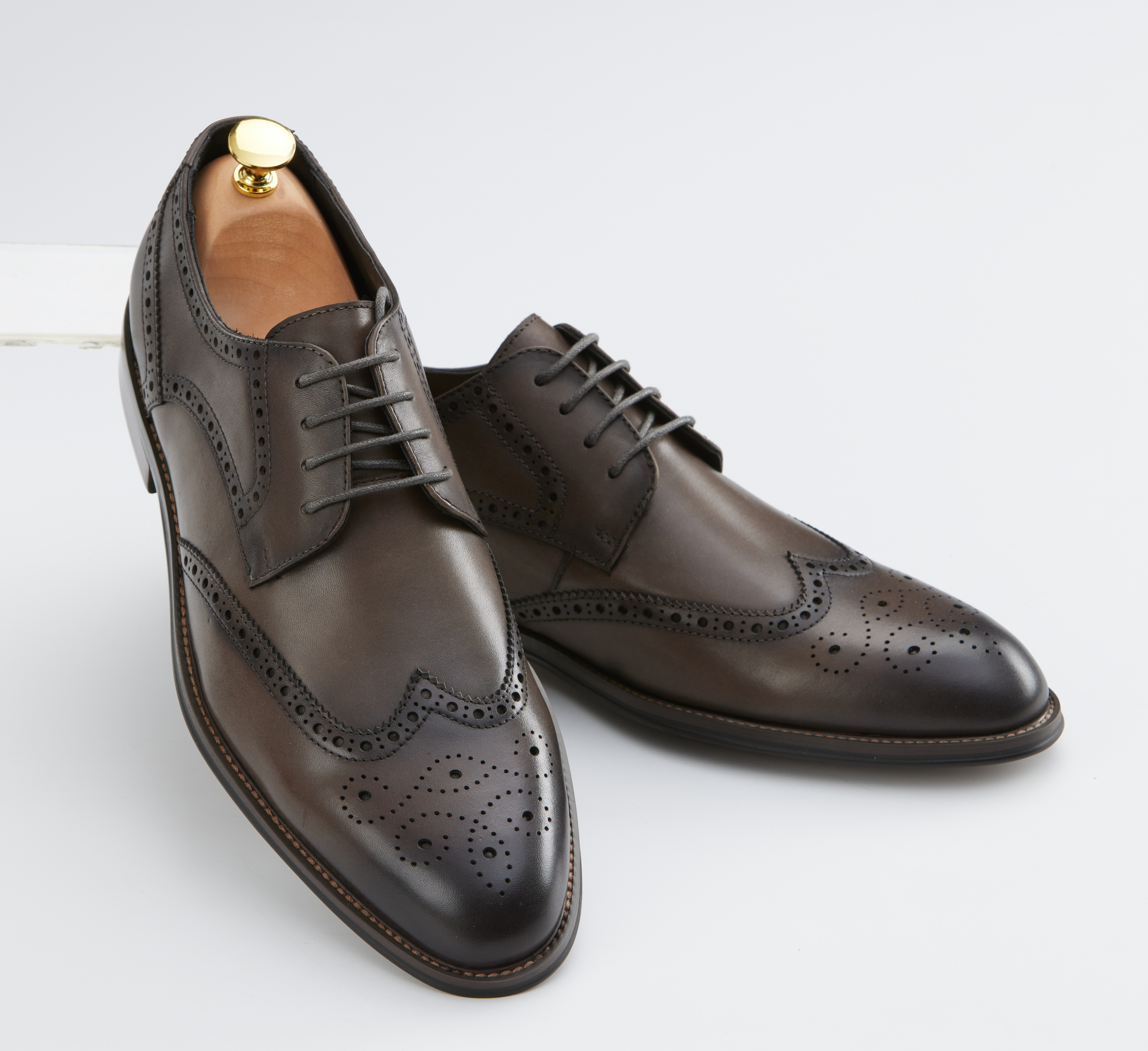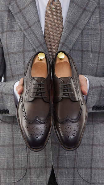 Верх выполнен из 100% натуральной кожи с благородным матовым блеском. Декоративное брогирование на мыске и вдоль швов подчеркивает статусность модели и добавляет характер образу. Глубокий серый цвет универсален и гармонично сочетается как с деловыми костюмами, так и с ансамблями в стиле smart casual.