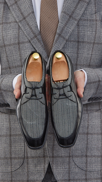Выразительная модель брогов с контрастной текстильной вставкой - свежий взгляд на классику, в которой традиции сочетаются с современным характером. Верх выполнен из 100% натуральной кожи в глубоких серо-черных тонах, а декоративная перфорация добавляет изящной сложности и визуальной глубины.